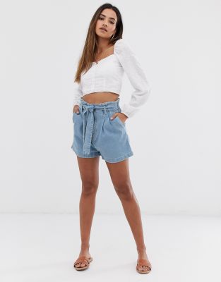 Stradivarius - Short en jean taille haute avec détail cargo - Bleu | ASOS